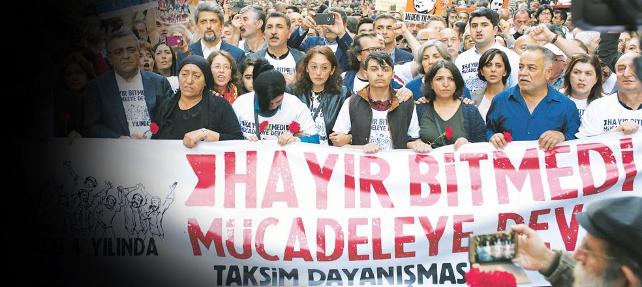 Gezi Parkı Direnişi’nin 4. yılında Taksim’de adeta olağanüstü hal ilan edildi. “Her yer Taksim, her yer direniş”, “Bu daha başlangıç, mücadeleye devam”, “Direne direne kazanacağız”, “Gezi’de düşene, dövüşene bin selam” sloganları atan kitlenin Gezi Parkı’na yürüyüşüne izin verilmedi. İstiklal Caddesi’nde oturma eylemi ve basın açıklaması yapan kitle “Hayır bitmedi, mücadeleye devam” mesajını verdi. Taksim Dayanışması’nın çağrısı ile Gezi Direnişi’nde yaşamını yitirenler için dün bir anma yapıldı. Sabah saatlerinden itibaren Taksim Cumhuriyet Anıtı ve Gezi Parkı’na çıkan yollar polis bariyerleri ile kapatıldı, zırhlı araçlar ve TOMA’larla geniş güvenlik alındı. Taksim Dayanışması bileşenleri, siyasi parti temsilcileri, Gezi Parkı direnişinde yaşamını yitiren Berkin Elvan’ın annesi Gülsüm ve babası Sami Elvan, Ali İsmail Korkmaz’ın babası Şahap Korkmaz, Ethem Sarısülük’ün annesi Sayfı Sarısülük, Mehmet Ayvalıtaş’ın babası Ali Ayvalıtaş, Ahmet Atakan’ın annesi Emsal Atakan, HDP Milletvekili Garo Paylan, HDP Eş Genel Başkan Yardımcısı Beyza Üstün, CHP Milletvekili Sezgin Tanrıkulu, Dr. Ali Şeker, Onursal Adıgüzel, ÖDP Genel Başkanı Alper Taş, HTKP Genel Başkanı Erkan Baş, EMEP Genel Başkanı Selma Gürkan, EMEP MYK Üyesi Levent Tüzel, sanatçı Ferhat Tunç ile çok sayıda kişi yoğun engellemeye karşın Taksim’deki Makina Mühendisleri Odası önünde dün saat 19.00 sıralarında bir araya geldi.