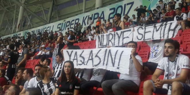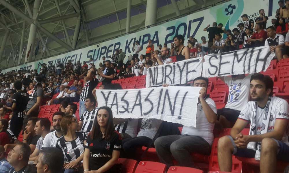 Samsun Valiliği, Beşiktaş-Konyaspor arasındaki Süper Kupa maçında, Nuriye Gülmen ve Semih Özakça için açılan “Nuriye Semih Yaşasın” pankartı açanlara “terör örgütü propagandası” suçundan adli soruşturma açıldığını duyurdu. Samsun Başsavcılığı tarafından da Süper Kupa finalinde ‘Nuriye Semih yaşasın’ yazılı pankartı açtıkları iddiasıyla Beşiktaş’ın Beleştepe taraftar grubundan 17 taraftar hakkında yakalama kararı çıkarıldı.