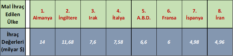 (Tablo 1: 2016 yılında ihracata en çok katkısı olan ilk 8 ülke)