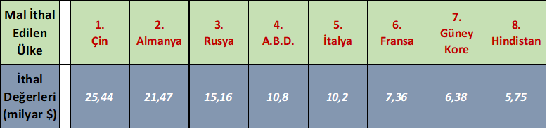 (Tablo 2: 2016 yılında ithalata en çok katkısı olan ilk 8 ülke)