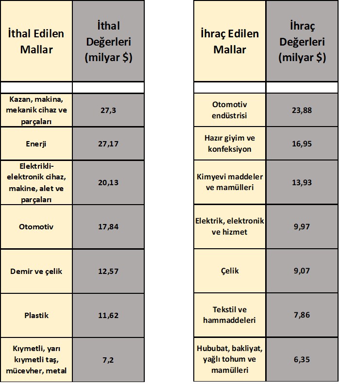 (Tablo 3 ve 4: 2016 yılında ithalat ve ihracatta en çok katkısı olan mallar)