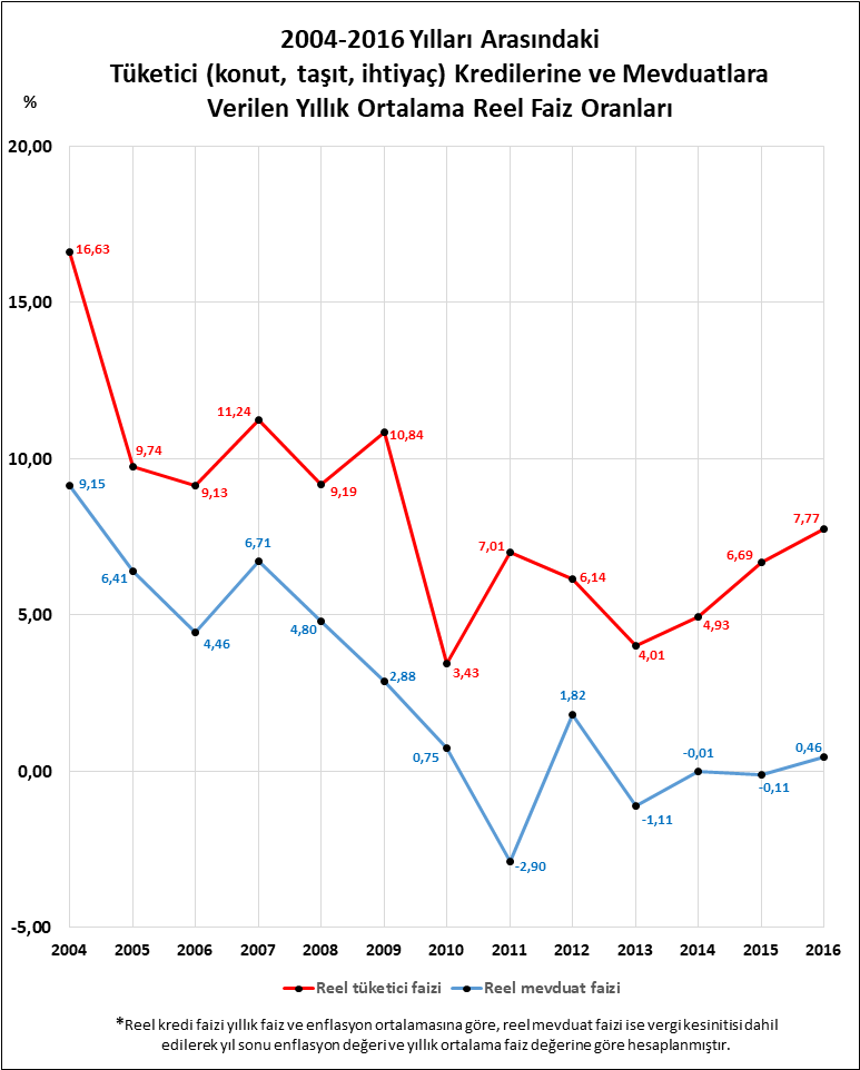(Grafik 11: 2004-2016 Tüketici kredisi ve mevduat reel faiz oranları karşılaştırması)