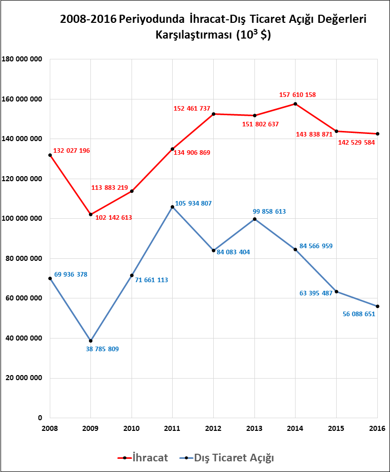 (Grafik 13: 2008-2016 İhracat-dış ticaret açığı karşılaştırması)