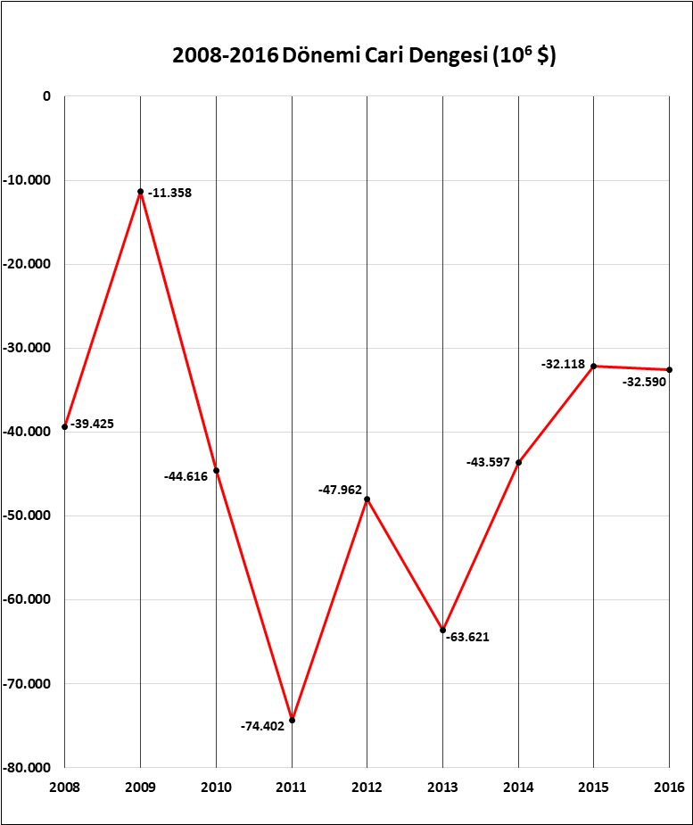 2001-2009 arasında sürekli düşüş gösteren (açık düşüşü), 2011 yılında en dibi gören (74,4 milyar $), 2013 yılından 2015 yılına kadar da yine düşüşünü sürdüren cari açık 2016 yılında yerini yükselişe bıraktı (32,59 milyar $). Bu durumu anlamak için biraz detaylı olarak cari dengeyi oluşturan toplamları inceleyelim. Öncelikle, cari denge, bir devletin bir yıl içerisindeki dış ticaret dengesi, gelir dengesi (yatırım-tasarruf), hizmet dengesi ve cari transfer başlıklarının toplamından oluşmaktadır. Tüm bu başlıkların toplamının sıfıra eş olması ya da birbirlerini karşılaması denge olduğunu, eksi bir değer oluşması açık olduğunu, pozitif bir değer oluşması da fazlalık oluştuğunu ifade etmektedir. Cari denge incelemesine ithalat-ihracat (dış ticaret) ile başlayalım. Ayrı olarak ele aldığımız dış ticaret başlığında da görüleceği üzere, 2013 yılından 2016 yılına kadar ihracat-ithalat açığında bir düşüş görülmekte. Fakat, 2014 yılında 157,6 milyar $ ile tüm zamanların en yüksek ihracat değeri 2016’da 142,53 milyar $’a düşmüş ve yine aynı biçimde 2014 yılında 242,1 milyar $ olan ithalat değeri 2016 yılında 198,6 milyar $’a düşmüştür. Dışarıdan bakıldığında iyi, içeriden ise kötü olan dış ticaret dengesi, görünümde iyileşiyor gibi gözükse de içerik incelendiğinde bir iyileşmeden söz etmek zor. Hizmet dengesi (hizmet sektörünün ihraç ve ithali) tarafı ise cari dengeyi iyileştirmeye çalışan en büyük kalem (diğeri de cari transfer). 2011-2014 aralığında yükselişini sürdüren ve 2014 yılında 26,768 milyar $’a ulaşan hizmet dengesi (fazlası) 2015 itibariyle düşüşe geçmiş 2016 yılında ise 15,468 milyar $ olmuştur. Ek olarak, hizmet gelirleri 2014 yılında 51,657 milyar $ seviyesindeyken 2015’de düşüş başlamış ve 2016 yılında 37,245 milyar $’a kadar düşmüştür. Yatırım dengesine baktığımızda ise, 2015 yılında 9.642 milyar $’lık yatırım açığı 2016 da 645 milyon $’lık iyileşmeyle 8,997 milyar $’lık açığa düşmüştür. Yatırım gelirleri 2015 yılına göre 2016 yılında 840 milyon $ artarak 5,31 milyar $ olsa da 2008 yılında 7,67 milyar $ olan gelir değerinden uzaktadır. Yatırım giderleri ise 2016’da 14,3 milyar $ ile 2008’den sonraki en yüksek seviyesinde. Nihai olarak pek iyi görünümlü olmasa da cari açık 2011’e göre ciddi düşüş göstermiştir. Fakat bu durumun esas nedeni bütçe açığı yanlı büyüme yerine, yani devlet borçlanması ve devlet yatırımları biçiminde bir büyüme yerine tercih dilen cari açık yanlı yani özel kesimin dışarıya borçlanarak ülkeye yatırım-mevduat getirilmesiyle gerçekleştirilen büyümenin gittikçe derin bir cari açık yaratıyor olması sonucunda (2011-2013) bu açığın kapatılmasına yönelik politikaların izlenmesidir. Yine fakat ki bu politika sonucu cari açık düşüşü gerçekleşmiş ancak diğer yandan da büyüme yavaşlamış, işsizlik de artmıştır. Son olarak, 2016 ile 2017’nin Ocak-Haziran dönemlerini karşılaştırarak aynı değerler inceleyelim. Dış ticaret dengesinde, 2016’da O-H dönemi için 28 milyar $ açık olmuş, 71,58 milyar $ ihracat ve 99,65 milyar $ ithalat olmasına karşılık aynı dönemin 2017 yılında ise 30,87 milyar $ açık, 77,45 milyar $ ihracat ve 108,32 milyar $ ithalat gerçekleşmiştir. Hizmet dengesi tarafında ise, 2016 O-H döneminde 4.9 milyar $ fazla oluşmuş, 16,2 milyar $ gelir ve 11,3 milyar $ gider gerçekleşmiştir. 2017’nin aynı döneminde ise hizmet dengesi 6,09 milyar $ fazla oluşmuş, 16,79 milyar $ gelir ve 10,7 gider oluşmuştur. Yatırım dengesine baktığımızda ise, 2016 yılı O-H döneminde 4,54 milyar $ açık oluşmuş, gelirler 2,84 milyar $ ve giderler de 7,38 milyar $ olmuştur. 2017’nin aynı döneminde ise açık 5,48 milyar $’a yükselmiş, gelirler 2,49 milyar $’a düşmüş ve giderler 7,97 milyar $’a çıkmıştır (Gelirde inşaat sektörünün katkısı büyük). Genel olarak bakıldığında ise 2017 Ocak-Haziran döneminde 20,77 milyar $’lık cari açık gerçekleşmiş ve 2016’nın aynı dönemine göre 1,73 milyar $ artış göstermiştir. Tekrar yükselen cari açıktan ve bir yandan da artan bütçe açığından, devletin dengeli bir biçimde her iki taraftan da borçlanarak büyümeyi sağlamaya çalıştığını anlıyoruz. Ama, son dönemlere bakıldığında alınan dış borçlar daha çok var olan diğer borçları kapamaya ya da katma değeri olmayan, dışarıya pazarlanamayan yerlere (örn. İnşaat sektörü) harcanmış olduğu görülmektedir.