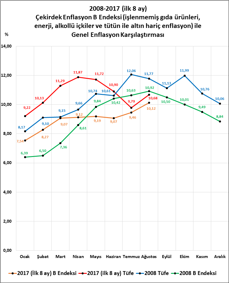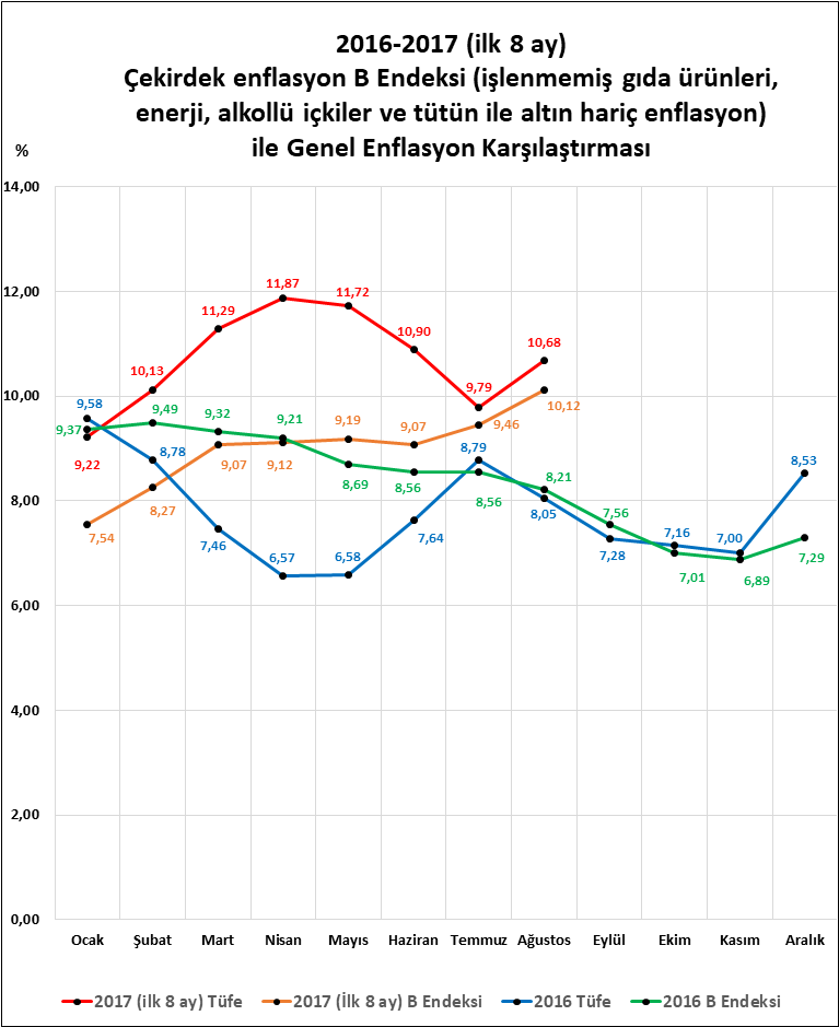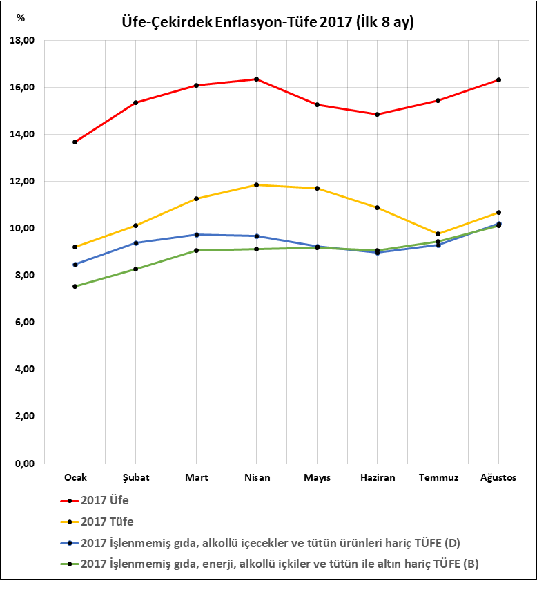 İkinci olarak çekirdek enflasyon değerlerini inceleyelim. Çekirdek enflasyon, genel enflasyon değerlerindeki (tüfe-tüketici enflasyon değeri) bazı kalemlerin ayrı tutularak, farklı türdeki ve farklı fiyat etkisi altındaki malların fiyatlarındaki değişimin incelendiği enflasyon türüdür. 2017 Çekirdek enflasyon değerlerine bakıldığında ise yine yüksek bir seyir görülmektedir. Öte taraftan ise enflasyon denilince akla gelen en “popüler” kalem olan tarımsal ürünler/işlenmemiş gıdada ise Haziran ve Temmuz aylarında ciddi düşüş yaşamasına rağmen genel enflasyonun yüksekliği devam etmektedir (%10,68). Bu da, enflasyon yüksekliğinin sebebinin “saptırıldığı” gibi (örn. Nihat Zeybekçi’nin ve Mehmet Şimşek’in enflasyon hesabı içerisindeki gıdanın payının düşürülmesiyle enflasyonun düşeceğini söylemesi, vb.) yalnız gıdadan olmadığını, başka sorunlar olduğunu göstermektedir.