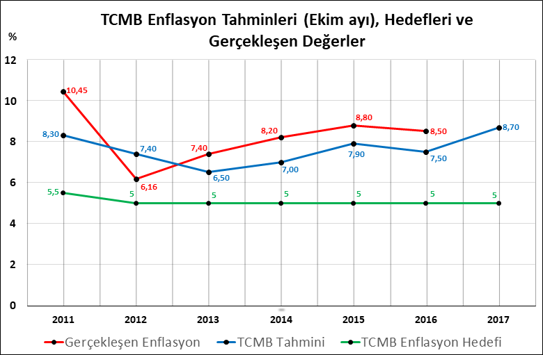 Enflasyon, belirli dönem içerisinde, seçilen belirli mal ve hizmetlerin fiyatlarında gerçekleşen sürekli artış üzerinden hesaplanan fiyatlar genel seviyesi değişimidir. 2010-2011 döneminde enflasyon, devlet tarafından gelecek yıllar için %5-4 olarak hedeflenmişti. Fakat, bugüne kadar izlenen politikalara ve yapılan uygulamalara bakıldığında zor gözüken bu hedef, 2012 Mayıs ile 2017 Ocak periyodunda tek hanelerde seyrederken 2017 Şubat ayında %10,13 ile tekrar çift hanelere ulaşarak bu hedefin mümkün olmadığını tekrar gösterdi. 2016 ilk yarısında önceki dönemlere göre düşüş gösteren enflasyon Haziran ayı sonuyla beraber yükselmiş, ardından temel mallar, gıda ürünlerinin fiyatlarının düşüşüyle 2016 3. ve 4. çeyrek arasında genel enflasyon da düşüşe geçmişti. Fakat ilerleyen dönemde, devletin kontrolünde olan kalemlerin (alkollü ürünler, tütün ürünleri, enerji vb.) yükselen fiyatlarıyla (vergi vs.) hedeflenen enflasyon değerleri yine tutmamış, 2016 Aralık’tan (%8,53) 2017 Nisan’a kadar yükseliş sürmüştü. 2017 yılında ise, Nisan ayına kadar %11,87 ile yükselişini sürdüren enflasyon, Temmuz sonunda %9,79’a kadar düşüş gösterdi. Bu düşüşün arkasında ise, Tcmb’nin ciddi faiz artırımıyla beraber döviz kurlarının, dış piyasaların etkileri ile işlenmemiş gıdadaki, altındaki fiyat düşüşleri (enflasyon değeri azalışı) ve her sene bazı ürünlere uygulanan vergilerin (örn. Sigara, benzin) uygulanmamış olması bulunmaktadır. Fakat ne var ki bu gerçekleşmesi muhtemel bir düşüştü. Diğer yandan, bu seyretmekte olan nispi enflasyon düşüşü devlet cenahı, banka yöneticileri vb. çevreler tarafından gelecek dönemlerde de düşüşün süreceği düşünülerek olumlu yorumlanmıştı. Ancak, enflasyonun baş sebebi olarak gösterilen gıda ürünlerinin enflasyon değeri Temmuz ayında önceki aya göre yaklaşık olarak 2 kat düşmesine rağmen genel enflasyon değeri %9,79 ile çift haneli bir değere çok yakın kalmış, Ağustos ayında da tüm bu yorumları/öngörüleri yanlışlayarak %10,68’e yükseldi.