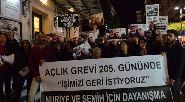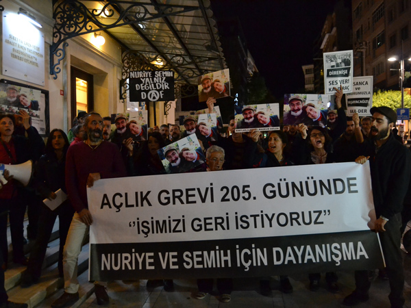 Eylemciler Saat 19.30’da Süreyya Operası önünde “Açlık grevi 205. gününde. İşimizi geri istiyoruz” pankartıyla toplandı. “Nuriye, Semih yaşayacak”, “Direne Direne Kazanacağız” sloganlarıyla başlayan eylemde Av. Tamer Doğan hukuki süreçle ilgili bilgi verdi.