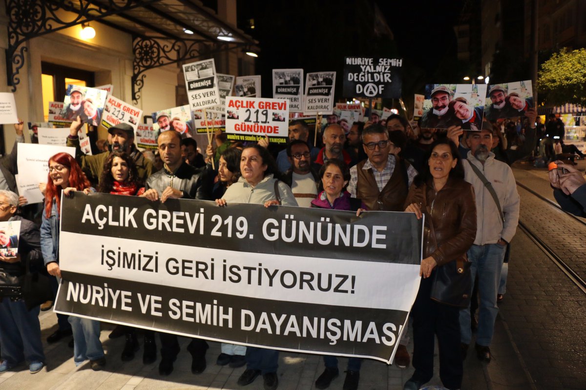 Nuriye ve Semih İçin Dayanışma Platformu, Olağanüstü Hal (OHAL) kapsamında çıkarılan Kanun Hükmünde Kararnameler (KHK) ile ihraç edildikleri işlerine geri dönmek amacıyla 219 gündür açlık grevinde olan tutuklu eğitimciler Nuriye Gülmen ve Semih Özakça’ya destek olmak amacıyla bu Cuma da Kadıköy Süreyya Operası önünde bir araya geldi. “Açlık grevi 219. gününde İşimizi geri istiyoruz” pankartının açıldığı eylemde sık sık “Nuriye Semih yalnız değildir”, “Zorla müdahale işkencedir” sloganları atıldı. Eyleme Ankara Yüksel Caddesi’nde 339 gündür devam eden eylemin simge isimleri Acun Karadağ ve Veli Saçılık’ın yanı sıra çok sayıda kişi katıldı. Acun Karadağ, tüm saldırılara rağmen direnmeye devam ettiklerini söyleyerek, “Direniş gücünü haklılığımızdan alıyoruz. Asla yılmadık çünkü sırtımızda iki canın yükü vardı.O sırtı kimse yere getiremez” dedi.