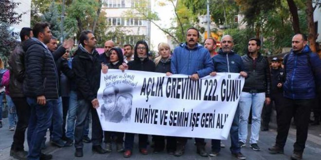 “Nuriye ve Semih’in açlık grevi 222. gününde. Nuriye ve Semih işe geri alınsın” pankartı açan eylemcilere biber gazı ve plastik mermi ile saldıran polis tarafından 6 kişi gözaltına alındı. Saldırıda Veli Saçılık, Acun Karadağ, Gülnaz Bozkurt, İlker Işık, Perihan Pulat ve Turgut Türksoy’un gözaltına alındığı öğrenildi.