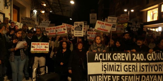 KHK ile işten atılan ve 240 gündür açlık grevinde olan Nuriye Gülmen ve Semih Özakça her Cuma olduğu gibi bugün de Kadıköy’de eylem gerçekleştirildi. Nuriye ve Semih İçin Dayanışma’nın çağrısıyla saat 19.30’da Süreyya Operası önünde toplanan eylemciler “Açlık grevi 240. gününde. İşimizi geri istiyoruz” pankartı açtı. Gülmen ve Özakça’nın fotoğraflarının yer aldığı dövizler de taşındı.