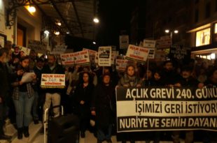 kategori: HaberlerKHK ile işten atılan 247 gündür açlık grevinde olan eğitimciler Nuriye Gülmen ve Semih Özakça ile dayanışmak için her Cuma olduğu gibi bugün de Kadıköy’de eylem düzenlendi. Nuriye ve Semih İçin Dayanışması’nın çağrısıyla yapılan eylemde Nuriye ve Semih’in taleplerinin kabul edilmesini istendi. Süreyya Operası önünde bir araya gelen eylemciler “Açlık Grevi 247. Gününde İşimizi Geri…