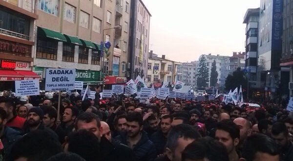 Serdaroğlu’nun konuşmaları işçiler tarafından sık sık “Grev istiyoruz!”, “Başkan bizi greve götür!” sloganları ile kesildi. Konuşmasının tamamını yapamayan Serdaroğlu, patronların OHAL’e güvendiğini ama güvenmemesi gerektiğini söyleyip “MESS dayatmalarına karşı fabrikalarda yapılan eylemlerin daha da sertleşerek devam edeceğini” belirtti. Serdaroğlu konuşmasını sonlandırmaya hazırlanırken meydanda bulunan işçiler “Grev, işgal, direniş!” ve “Baskılar bizi yıldıramaz!” sloganlarını dakikalarca attılar. “Başkan bizi greve götür” ve Kroman, Zf Sachs, Yücal Boru ve Fontana gibi çeşitli fabrikalardan işçilerin “Grev istiyoruz” sloganları üzerine Serdaroğlu “Arkadaşlar zaten siz istemezseniz de süreç greve gidiyor” diyerek grev kelimesini kullandı. (Kaynak: Kızıl Bayrak)
