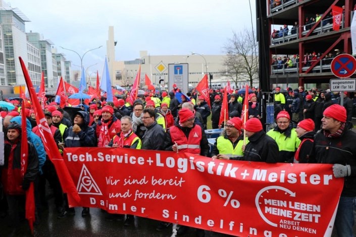 Buna karşı metal işçileri uyarı grevlerinin ikinci haftasında da kitlesel eylemlerini sürdürüyorlar. Üç küçük işletmede 370 işçiyle 2 Ocak günü başlayan uyarı grevlerine iki hafta içinde 2 binden fazla fabrikadan 400 binden fazla işçi katıldı. Bu sayının önümüzdeki günlerde 500 bini aşacağına kesin gözüyle bakılıyor.