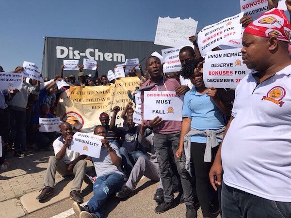 ‘Sağlık ve güzellik’ sektöründe mağazalar zinciri bulunan ‘Dis-Chem Pharmacy’ patronlarının sendikayı red etmekle kalmayıp sendikalı işçileri cezalandırmaya çalışması karşısında işçiler bugün Midrand ve Delmas şehirlerinde greve çıktılar.
