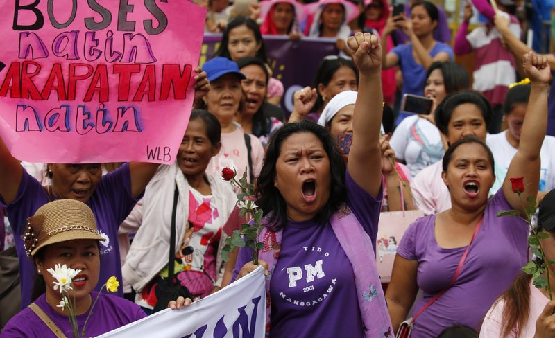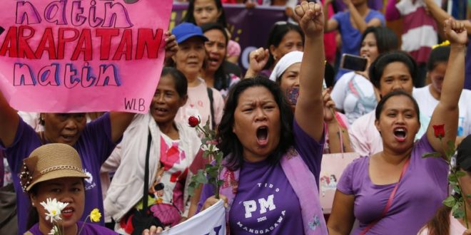 Filipinler’de pembe ve mor tişörtlü yüzlerce kadın, başkent Manila’daki Plaza Miranda’da toplandı.