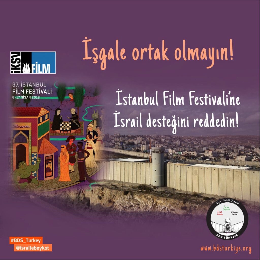 İKSV’nin düzenlediği İstanbul Film Festivali’nin bu yılki sponsorları arasında, ARTISRAEL adlı kurum aracılığıyla İsrail Dışişleri Bakanlığı’nın da bulunması üzerine İKSV’den sponsorluk ilişkisinden vazgeçmesi ve festivale katılan yönetmenlere filmlerini festivalden çekmelerine yönelik yaptığı çağrı karşılık buldu.