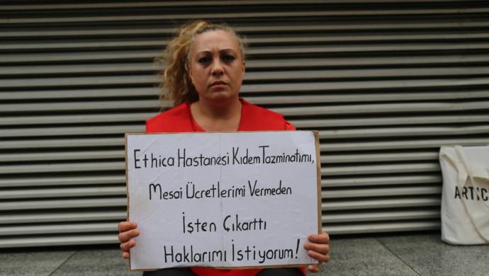Bakırköy Ethica hastanesi’nden “itaatsizlik ettiği” bahanesiyle 21 Mayıs’ta işten çıkarılan 49 yaşındaki Derya Koçak işine geri dönmek için oturma eylemine başladı.