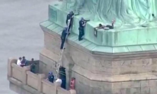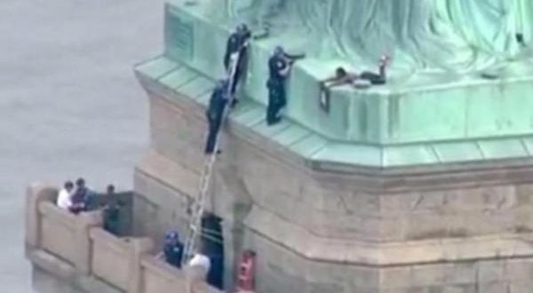 Adının Therese Okumou olduğu belirtilen ve heykele tırmanmaya çalışan eylemci, heykelin alt bölümünde üç saatten fazla oturduktan sonra gözaltına alındı. ABD’nin bağımsızlık günü olan 4 Temmuz’da gerçekleşen eylem sırasında turistler, heykelden uzaklaştırıldı. Polis olayı hem havadan hem de denizden takibe aldı.