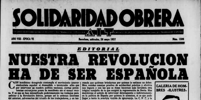Bir kez daha, Katalonya’daki CNT’nin ve nasyonal örgütünün sözcülerinin yayın organı olmaya devam eden Solidaridad Obrera’ya atıfta bulunuyoruz. 26 Mayıs’ta yayımlanan ve artık hiç de şaşırtıcı gelmeyen ‘Devrimimiz İspanyol olmalı’ başlıklı bir başyazı, kendimizi gülünç göstermeden bunu anarşist olarak nitelendiremeyeceğimiz ama yine de CNT tarafından ileri sürülen anarşizm ve Solidaridad Obrera’nın başyazarının her bir gözeneğinden sızan nasyonal şovenizm arasında bir bağlantı kurmaya çalışan bu yeni eğilimin bir örneğini sunuyor. Bu entelektüel salto lehine olan argümanlar kayda geçilmeyi hak ediyor ve biz de bu amaçla aşağıdaki pasajı sunuyoruz:
