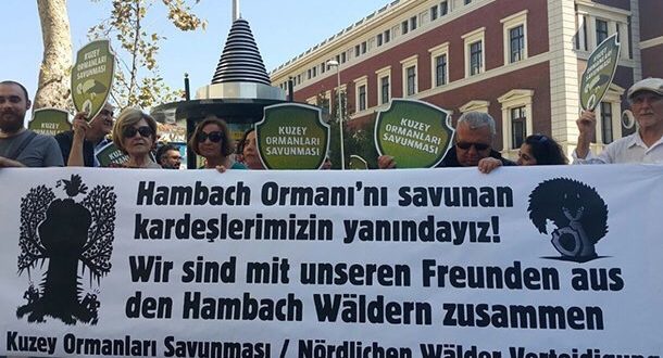 Almanya’da 12 bin yıllık geçmişe sahip Hambach Ormanı’nın, enerji devi RWE’ye ait linyit madenini büyütmek için katledilmesi ve direnen yaşam savunucularına karşı polis saldırıları İstanbul’da protesto edildi. Kuzey Ormanları Savunması’nın (KOS) çağrısıyla bir araya gelen yaşam savunucuları, bugün (24 Eylül) Taksim Gümüşsuyu’ndaki Almanya Başkonsolosluğu önünde basın açıklaması gerçekleştirdi.