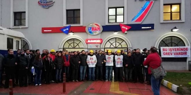 İzmir’de kent içi ulaşımın ana arterlerinden olan ve İzmir Büyükşehir Belediyesi ile Türkiye Cumhuriyeti Devlet Demiryolları ortak kuruluşu olan İZBAN’da şirket bürokratları ile Türk İş’e bağlı Demiryol İş Sendikası arasındaki toplu iş sözleşmesi görüşmelerinin tıkanması üzerine grev başladı. Bu sabah İZBAN’da seferler yapılmadı. Grev Alsancak Garına pankartın asılmasıyla başladı. Aliağa-Selçuk arasındaki banliyö hattında hizmet veren, ülkenin havalimanı bağlantılı, en büyük kent içi raylı toplu taşıma sistemlerinden biri olan İZBAN’da makinist, tekniker, teknisyen, istasyon operatörü, gişe çalışanı olarak çalışan 343 işçi de greve çıktı. 40 istasyona ve 136 kilometreye ulaşan İZBAN’da günde 400 bin civarında insan taşınıyor.