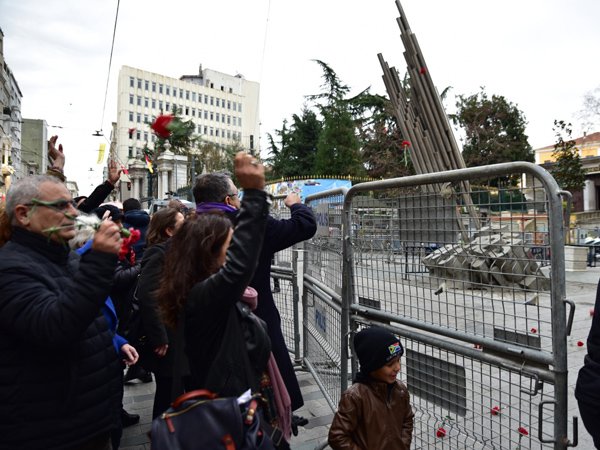 Gözaltında kaybedilen yakınlarının akıbetini 718 hafta boyunca sormaktan vazgeçmeyen Cumartesi Anneleri, “Beni Bul Anne” şarkısı eşliğinde 2019’un ilk gününde polis ablukası altındaki Galatasaray Meydanı’na giderek polis barikatlarının üstünden anıta karanfil bıraktı.