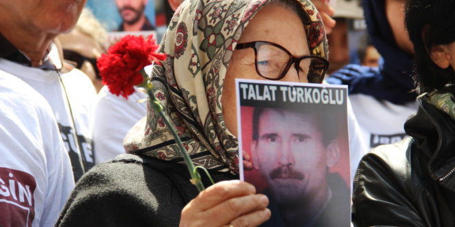 polis ablukası altında gerçekleşen oturma eyleminde gözaltında kaybedilen Talat Türkoğlu’nun akıbeti soruldu.
