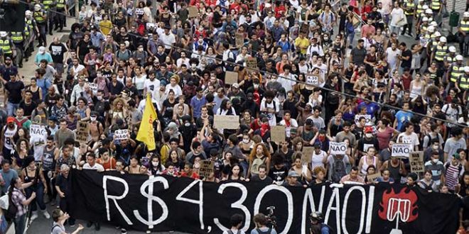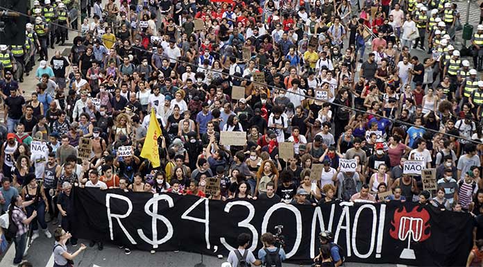 Kent merkezinde toplanan ve kamu eğitim kurumlarına yönelik bütçede yüzde 30 kesintiyi protesto eden göstericilere, son devlet başkanı seçiminde İşçi Partisinin adayı olan Fernando Haddad da eşlik etti.