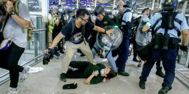 Hong Kong havalimanında beş gündür protestolarını sürdüren hükümet karşıtı eylemcilere polis saldırdı.