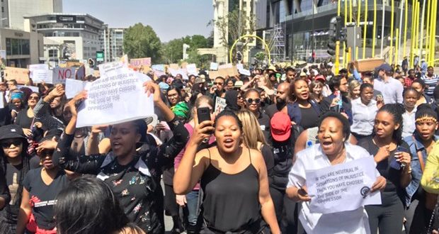 Güney Afrika’da büyük şirketlerde yaşanan çok sayıda cinsel saldırı ve kadın cinayeti sonrasında kadınlar öfkesini sokaklara taşıdı. #SandtonShutdown etiketiyle Twitter’da örgütlenen kadınlar, Sandton’daki Johannesburg Borsası (JSE) dışında toplandılar.