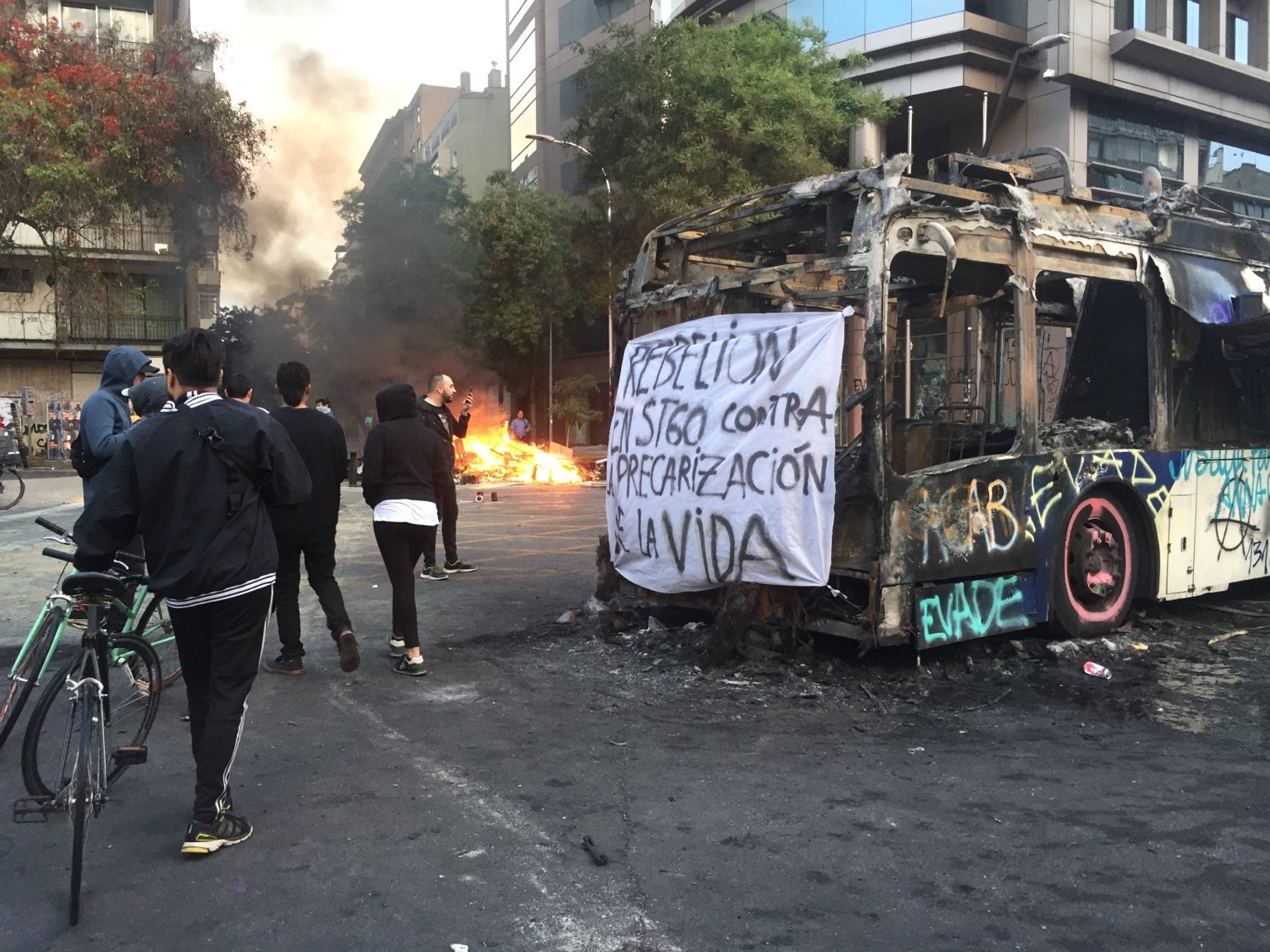 Protestocular örgütlü bir şekilde meydanlarda ve mahallelerde kalmaya devam ederken topluluk radyoları kısıtlanmış yayınları üzerinden Pinochet’nin askeri diktatörlüğü tarafından öldürülmüş olan Şili’li müzisyen Victor Jara’nın “El Derecho de Vivir en Paz” (Barış İçinde Yaşama Hakkı) şarkısını çalıyorlardı. Diktatörlükten 30 yıl sonra ve o karanlık zamanların temsilcileriyle aynı olan bir hükümet ile, Chadwick, Iturriaga ve tüm o hainler binlerce kişi tarafından dile getirilen Victor Jara’yı tekrar dinliyorlardı ve yeniden askerlerle birlikte sokaktaydılar. Tam o sırada uluslararası bir kanala yorum yapan kapüşonlu bir genç boş yere “döngüyü kırıyoruz” demiyordu.