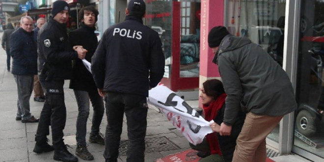 “Kanala hayır” sloganları atan SGDF Eşbaşkanı Deniz Bahçeci, SGDF üyesi Mert Karatağ ve ESP üyesi Gamze Toprak polis tarafından darp edilerek gözaltına alındı.