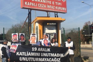 kategori: Haberlerİnsan Hakları Derneği (İHD) İstanbul Şubesi, 19 Aralık katliamının yıldönümünde Ümraniye Hapishanesi önünde basın açıklaması düzenledi. Basın açıklamasında, “19 Aralık katliamını unutmadık, unutturmayacağız” pankartının yanı sıra katledilen tutsakların fotoğrafları taşındı. “19 Aralık’ı unutma unutturma”, “İnsanlık onuru işlenceyi yenecek” sloganları atıldı. Açıklama yapan İHD Şube Başkanı Gülseren Yoleri, 19 Aralık’ta başlayan ve dört gün boyunca süren…