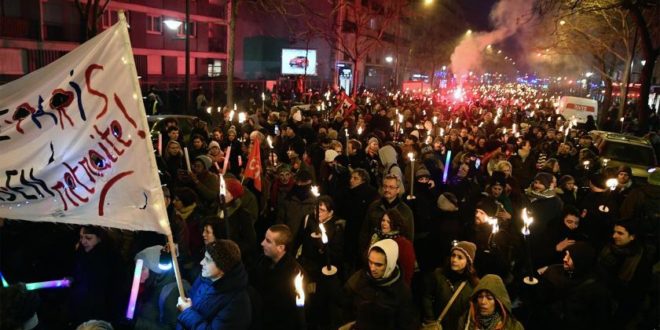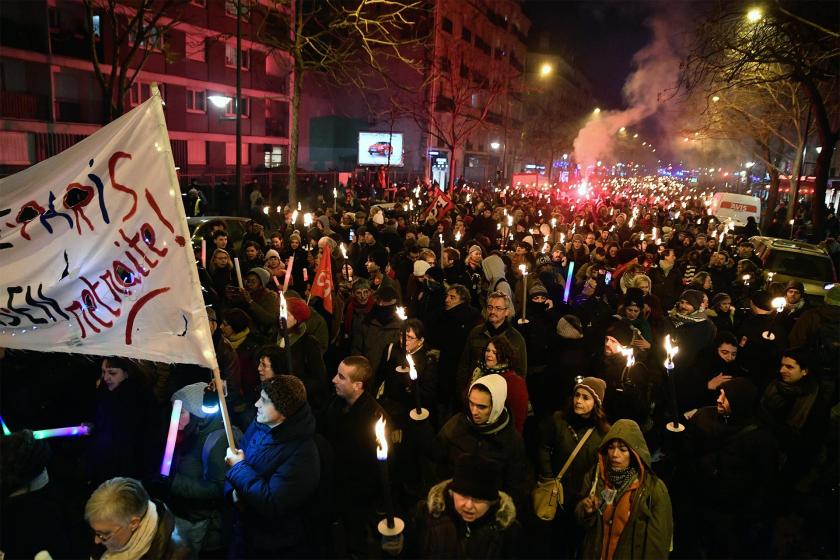 Paris’te bir araya gelen emekçiler, emeklilik reformuna karşı meşalelerle Nation Meydanı’ndan Republique Meydanı’na yürüdü. Eylemcilerin yürüyüş boyunca emeklilik reformu karşıtı sloganların yanı sıra “Grev, Blokaj, Macron Defol” ve “Devrim” sloganları atması dikkat çekti.