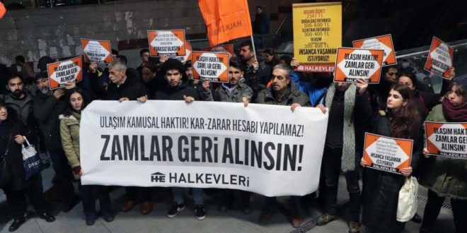İstanbul Halkevleri bugün Mecidiyeköy Metrobüs istasyonunda İstanbul Büyük şehir Belediyesi (İBB) tarafından gerçekleştirilen ulaşım zamlarını protesto etti. Eylemde sık sık “Ulaşım haktır satılamaz”, ”Ulaşım zamları geri alınsın” sloganları atılırken, işe gidiş ve geliş saatlerinde ulaşımın ücretsiz olması taleplerini içeren dövizler taşındı.