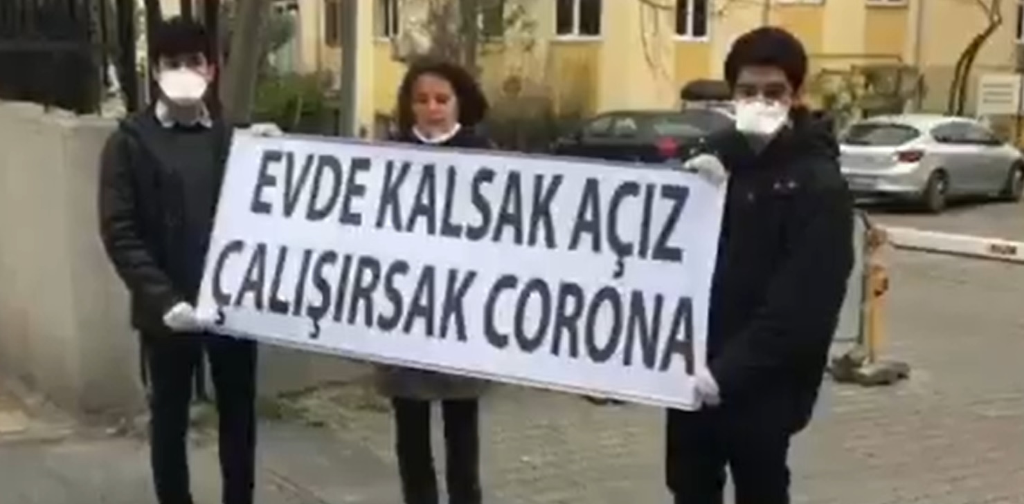 Koronavirüs politikalarına karşı kafe bar çalışanı üç genç İstanbul Aile Çalışma ve Sosyal Güvenlik İl Müdürlüğü önünde eylem gerçekleştirdi. Müdürlüğün girişinde “Evde Kalsak Açız Çalışırsak Corona” yazılı pankart açan eylemciler burada basın açıklaması okudu.