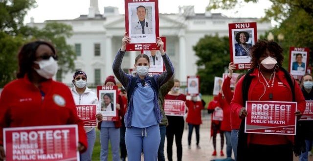 Beyaz Saray önündeki Lefayette Meydanı’nda bir araya gelen hemşireler, eylemde ABD’nin çeşitli eyaletlerinde Kovid-19 nedeniyle yaşamını yitiren meslektaşlarının isimlerini okudu. Eylem esnasında sosyal mesafeye uyan ve maske takan hemşireler, maske ve eldiven gibi kişisel koruma ekipmanlarına daha çok ihtiyaç duyduklarını ve bu taleplerini Başkan Donald Trump’ın kapısında ifade etmek istediklerini kaydetti. Ellerinde, koronavirüs nedeniyle yaşamını yitiren bazı hemşirelerin fotoğraflarını taşıyan hemşireler, “Ellerinizi yıkamak için kullandığınız 20 saniye, ellerinizdeki ‘kahraman’ kanını temizlemeyecektir” yazılı döviz açtı