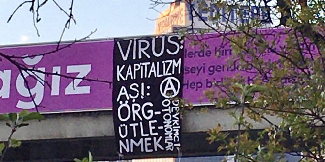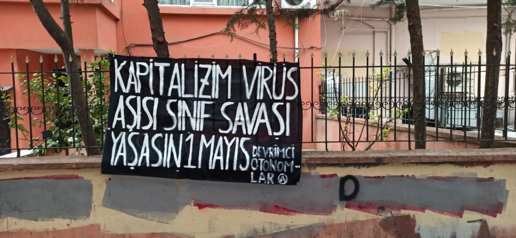 Devrimci Otonomlar tarafından Kozyatağı Üst Geçidi’ne “Virüs: Kapitalizm, Aşı: Örgütlenmek” Kocamustafapaşa’ya “Kapitalizm Virüs, Aşısı Sınıf Savaşı, Yaşasın 1 Mayıs” yazan pankartlar asıldı.