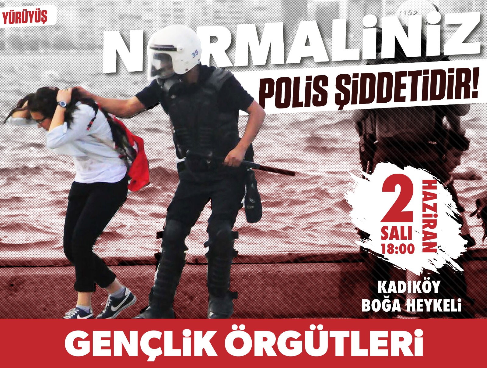 Aralarında Devrimci Otonomlar Gençlik İnisiyatifi’nin de bulunduğu gençlik örgütleri “Normaliniz Polis Şiddetidir!” sloganıyla artan polis şiddetine karşı eylem çağrısı. Çağrıda 2 Haziran Salı günü saat 18.00’de Kadıköy Boğa Heykeli’ne yürüyüş gerçekleştirileceği belirtildi.