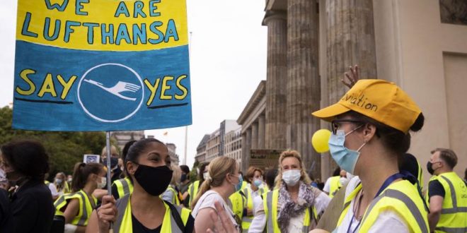 Berlin’de tarihi Brandenburg Kapısı önünde toplanan yüzlerce Lufthansa çalışanı üzerinde “Lufthansa’ya evet -Biz Lufthansa’yız” ve “Siz bizi koruyun ki biz de sizi koruyabilelim” dövizler taşıdı. Eylemde yapılan konuşmalarda, şirket yönetimi ile hissedarlar arasında toplantı yapılacağına işaret edilerek, Lufthansa’da çalışan 138 bin kişinin ve bunların ailelerinin toplantıdan çıkacak kararı beklediği hatırlatıldı. Şirketin hissedarlarına ve yönetime çağrıda bulunulan konuşmalarda, “Biz mutsuzuz ve endişeliyiz. Bizi bu korkudan kurtarın. Şirket ve biz çalışanlar için sorumluluk alın” ifadeleri kullanıldı.