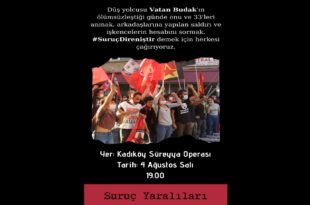 kategori: HaberlerSuruç Yaralıları tarafından Suruç katliamında yaşamını yitiren anarşist Vatan Budak’ın ölüm yıl dönümü olan 4 Ağustos’ta Kadıköy Süreyya Operası önüne çağrı yapıldı. 4 Ağustos saat 19.00’da Kadıköy Süreyya Operası’na #SuruçDireniştir etiketiyle yapılan eylem çağrısında “Düş yolcusu Vatan Budak’ın ölümsüzleştiği günde onu ve 33’leri anmak, arkadaşlarına yapılan saldırı ve işkencelerin hesabını sormak, #SuruçDireniştir demek için herkesi…