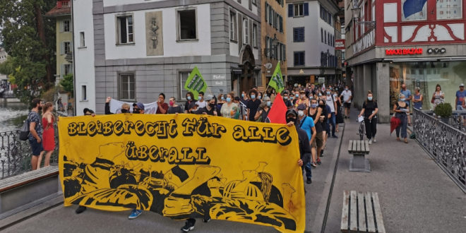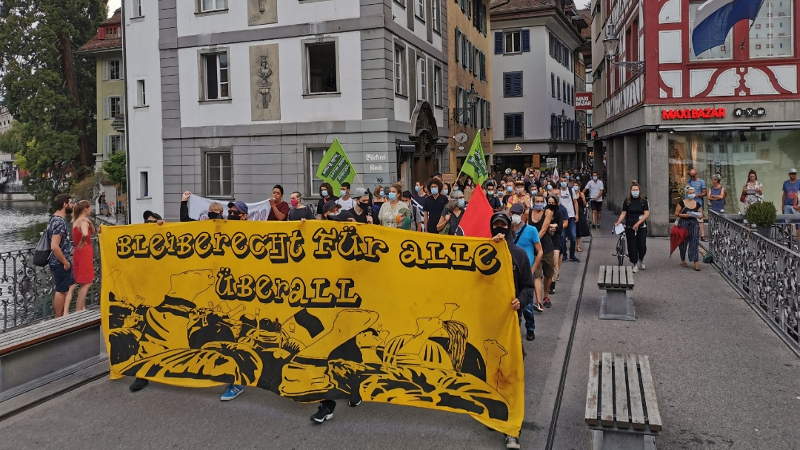 Mühlenplatz’da toplanan eylemciler Luzern çarşısına yürüdü. Burada yapılan açıklamada, dış düzenlemelerle şekillenen ve Mart 2019’da federal sığınma kampının açılmasıyla daha da kötüleşen sistem eleştirilirken, mülteciler için daha “fazla kendi kaderini tayin etme hakkı tanınsın” çağrısı yapıldı.