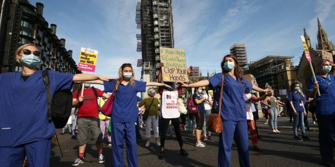 Yüzlerce sağlık çalışanı, Başbakan Boris Johnson’ın da yeni tip koronavirüse yakalandığı dönemde tedavi gördüğü St Thomas Hastanesi önünde toplandı. Eylemde Johnson’a yönelik olarak “Biz senin hayatta kalmanı sağladık şimdi sen bizim hayatta kalmamızı sağla” ve “Alkışlamak faturalarımı ödemeyecek.” dövizleri taşındı. Eylemde ayrıca salgınla birlikte ortaya çıkan, kişisel koruyucu ekipman eksikliği gibi sağlık sistemindeki sorunlara da dikkat çekildi.