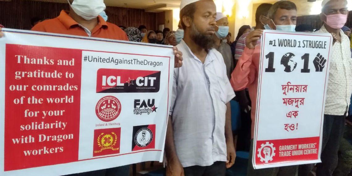 Bangladeş’in başkenti Dakka’da bulunan, yaklaşık 6000 kişinin çalıştığı Dragon Sweater fabrikasının Mart ayında kapanmasının ardından ücretleri ve tazminatları ödenmeden işten çıkartılan işçiler mücadeleye devam ediyor. Covid-19 salgını bahanesiyle kapatılan fabrikanın sahipleri, Londra’da bir ofisi bulunan Dragon Group adlı büyük bir holdingin parçası.