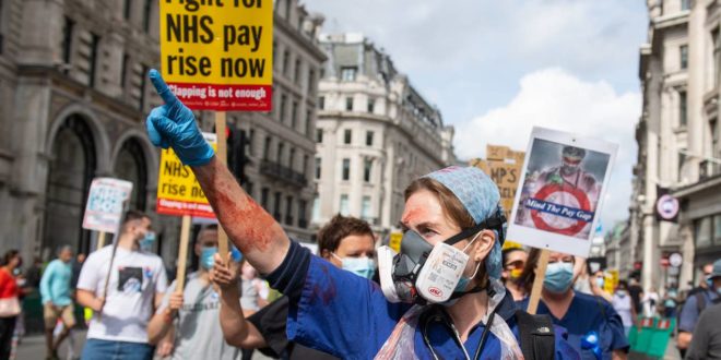 Önlük ve diğer medikal kıyafetleri giyen sağlık çalışanları,”Paha biçilmez ama parasız”, “Hayat kurtarıcıları kurtarın”, “Artık yeter”, “Alkışlarla akşam yemeği alınmıyor” yazılı dövizler taşıdı. BBC’nin Londra’daki binası önünde başlayan gösteri, Trafalgar Meydanı’nda sona erdi.