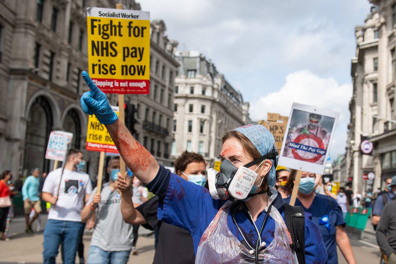 “640 sağlık çalışanı öldü. Elinizde kan var” yazılı pankartı taşıyan eylemciler yaşamını yitiren sağlık çalışanları için saygı duruşunda bulundu. En yaz %15 zam yapılması talebinin öne çıktığı eylemde başbakan Boris Johnson ve Sağlık Bakanı Matt Hancock başta olmak üzere hükümete tepki gösterildi. Sağlık çalışanları, Johnson ve Hancock’un yanı sıra Başbakan Yardımcısı Michael Gove ile Başbakan’ın karantina kurallarını ihlal etmekle suçlanan danışmanı Dominic Cummings’in ellerini kanlı gösteren posterler taşıdı.