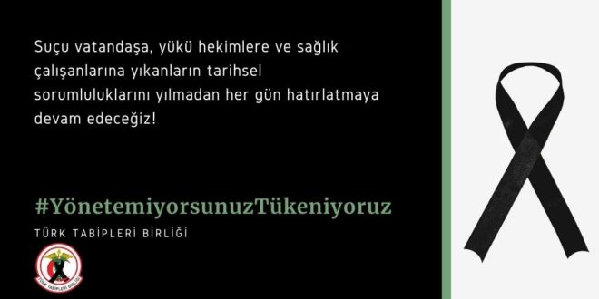 Türk Tabipleri Birliği’nin salgına yönelik bilimsel verilere dayanan uyarı ve önerileri toplumun sağlık ve yaşam hakkı için kamuoyu ile paylaşması evrensel, yasal ve etik sorumluluğudur. COVID-19 salgınında kaybettiğimiz meslektaşlarımızı siyah kurdele ile anmak ve başka kayıplar olmasın diye çabalamak ise kaybettiklerimize ve yakınlarına karşı vefa borcumuzdur.