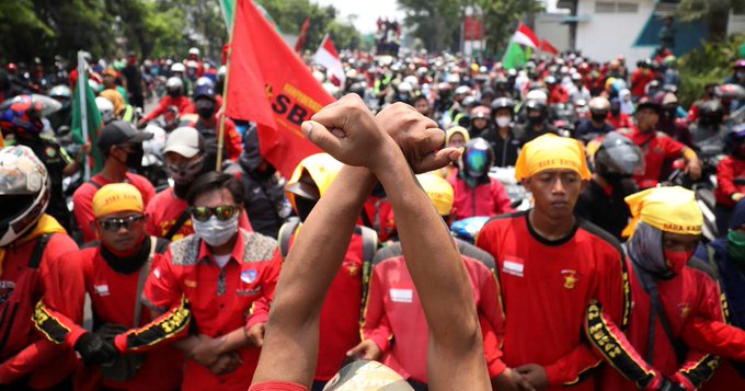 Yaşanacak Dünya’nın haberine göre başkent Jakarta’nın yanı sıra Medan, Yogyakarta, Bandung, Makassar, Ambon gibi çeşitli kentlerde bir araya gelen işçi ve öğrenciler, “çalışanların hak ve güvencelerinin yok sayıldığı” gerekçesiyle, yasalaşan istihdam düzenlemelerine karşı gösteri düzenliyor. Eylemlere yönelik polis saldırısında 400 civarında eylemcinin gözaltına alındğı açıklandı.