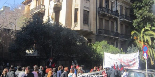 Yunanistan’da işgal evlerinin hedef gösterilmesi üzerine Pazartesi günü Galatsi şehrinde gerçekleşen anti-faşist eyleme polis saldırdı.