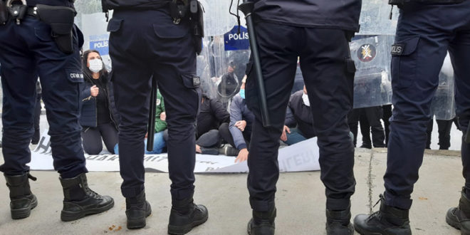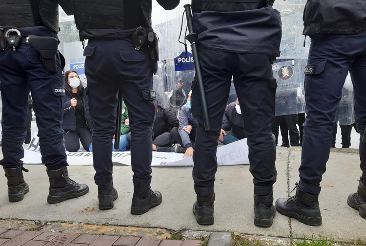 Polisler üniversite girişine yığınak yaparken, işçiler “Vedat Akgiray ders verme, hakkımızı ver” yazılı pankart açtı. Bir süre sonra işçilerin etrafını saran polis, basının görüntü almasını da engellemeye çalıştı. Daha sonra işçilere saldıran polis Bimeks işçileri Bünyamin Bilikci, Leyla Akıncı, Adem Demir, Umut-Sen Sözcüsü Başaran Aksu ve Betül Celep’i gözaltına aldı.